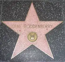 После окончания «Звёздного пути» (оригинального сериала) он был номинирован на премию «Хьюго» за два телефильма, «Генезис II» и «Плёнки Квестора»[20][21][Note 2]. В дополнение к наградам Родденберри также получил звезду на Голливудской «Аллее славы» после кампании фан-клубов «Звёздного пути», которые стремились к тому, чтобы каждый фанат пожертвовал доллар на общую стоимость содержания в размере 3500 долларов[24]. После этих пожертвований комитет, отвечающий за Аллею славы, проголосовал за Родденберри. Открытие звезды состоялось 4 сентября 1985 года в квартале 6600, недалеко от угла Голливудского бульвара и Лас-Пальмаса. На церемонии вступления присутствовали весь главный актёрский состав «Звёздного пути», а также Роджер Ч. Кармел, который сыграл Гарри Мадда в «Оригинальном сериале»[24]. После смерти Родденберри в 1991 году[25], он был посмертно награждён Мемориальной премией Роберта А. Хайнлайна Национальным космическим обществом и Мемориальной премией Джорджа Пала на 18-й церемонии вручения наград премии «Сатурн». Он также был награждён медалью за общественные заслуги Национальным управлением по аэронавтике и исследованию космического пространства (НАСА)[26][27].