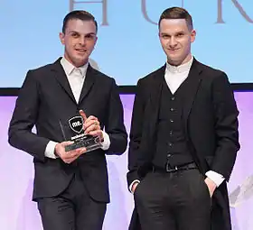 Тео Хатчкрафт (слева) и Адам Андерсон из Hurts получают награду Musikexpress Style Award в категории Лучший иностранный исполнитель 18 октября 2010 в Берлине (Германия). | ||||||||