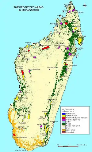 Всего на Мадагаскаре насчитывается 59 охранняемых территорий, занимающих 17 553 км2 суши (2,95 %) и 4558 км2 моря (0,38 %)[1].