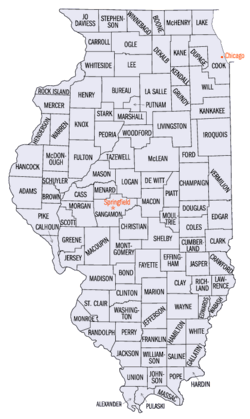 Столица штата (Спрингфилд) располагается в округе Сангамон, крупнейший город штата (Чикаго) — в округе Кук.
