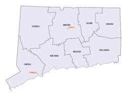 В настоящий момент список округов в штате Коннектикут состоит из восьми позиций. Четыре округа были основаны в 1666 году, во время первой консолидации колонии Коннектикут из ряда более мелких колоний. Два округа сформировались во время колониальных времен, и последние два, Мидлсекс и Толланд, были созданы после провозглашения независимости (1785). Шесть из округов названы в честь некоторых мест в Англии, откуда родом были многие ранние поселенцы Коннектикута.[1] Несмотря на то, что Коннектикут разделён на округа, здесь нет окружного правительства и местное самоуправление остаётся в городах и поселениях.[2][3]
