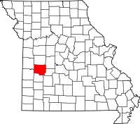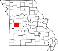 | Округ Бентон | 015 | Уорсо | 1835 | Сформирован из округов Петтис и Грин | В честь Томаса Харта Бентона (1782–1858), сенатора от Миссури | 18 461 | 1829 км² | ![]() |