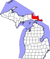 | Лус Luce | Ньюберри | 26095 | 1887 | Из частей округов Чиппева и Макино | В честь губернатора Мичигана Сайруса Люса (1824—1905) | 6426 | 2329 | 3 | ![]() |