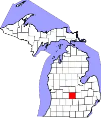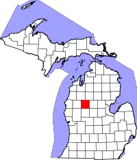 | Клэр Clare | Харрисон | 26035 | 1840 | Из части округа Макино и свободной территории. До 1843 года назывался Kaykakee | По названию графства Клэр в Ирландии | 30 652 | 1462 | 21 | ![]() |