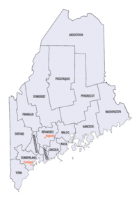 | Сагадахок Sagadahoc County | 23023 | Бат | 1854 | 35 293 | 958 (суша — 657,1, вода — 301,3) | 53,7 | ![]() |