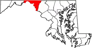 | Гарретт | 1872 | Окленд | 29 233 | 1699 / 1676 | 17,4 | Самый молодой и самый западный округ Мэриленда, а также округ с минимальной плотностью населения в штате. В округе находится высшая точка штата — «гора» Хойи-Крест (1024 м). Единственный округ Мэриленда, относящийся к бассейну Миссисипи. Единственный округ штата, входящий в т. н. «Национальную зону радиомолчания» (очень малая южная часть округа). | |