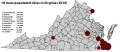 | Рэдфорд | Монтгомери | до 1854 / 1902 | 17 483 (2016) | 26,4 / 25,6 | 683 | В городе расположен университет, в котором обучаются ок. 9,5 тыс. студентов, т. е. ок. 54 % населения города. | |