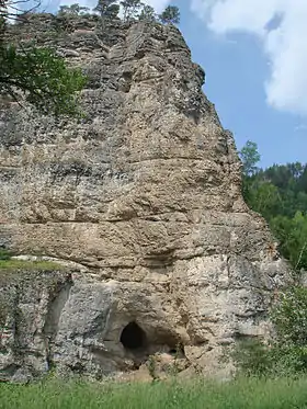 100 | 1. Живописная скала с пещерой. 2. Популяции редких видов растений (пырей отогнутоостый, шиверекия подольская, астрагал Клера, примула кортузовидная и др.). | 1. Охрана всего природного комплекса. 2. Охрана биоразнообразия. 3. Рекреационное значение. |