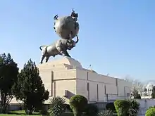 Монумент памяти жертв ашхабадского землетрясения 1948 года | мемориальный комплекс, созданный по инициативе Сапармурата Ниязова в виде могучего быка, удерживающего на своих рогах расколотую Землю, тела погибших и женщина, последним отчаянным движением рук поднимающая над руинами города маленького Сапармурата Ниязова. |