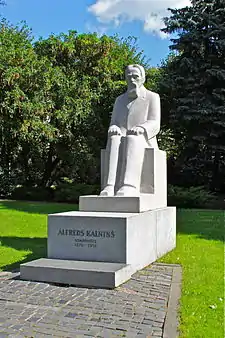- Надгробный памятник народному поэту Латвии Райнису на кладбище, названном его именем (скульптор Карлис Земдега, 1934)