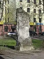 - Памятник разъединяющей и соединяющей стене (фрагмент бетонного блока из Берлинской стены) у здания Бизнес-центра на улице Элизабетес.