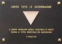 Оригинальный текст (итал.)[показатьскрыть]«Contro tutte le discriminazioni, il circolo Arcobaleno Arcigay Arcilesbica di Trieste ricorda le vittime omosessuali del nazifascismo»