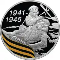 серебро | 65-я годовщина Победы в Великой Отечественной войне 1941-1945 гг.: (Санитарка, делающая перевязку раненому воину в поле) | ![]() |