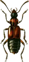 Жужелица Щеглова — Carabus stscheglovi Mannergeim, 1827 | 3 категория. Редкий вид, встречающийся в области за пределами основного ареала. | Встречается на территории Камышинского (Щербаковская балка, с. Белогорки) и Жирновского районов. Заселяет крупные балки с массивами байрачных лесов. Предпочитает сырые каменистые места вблизи водоёмов. Имаго активны с июня по сентябрь. Питается различными беспозвоночными[6]. | ||