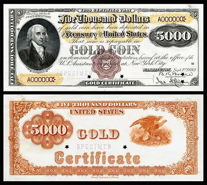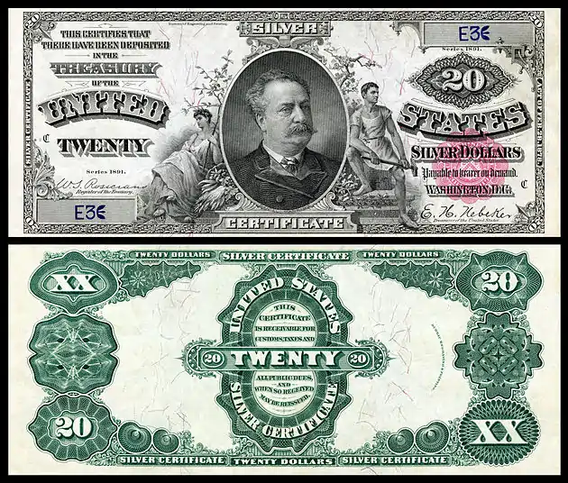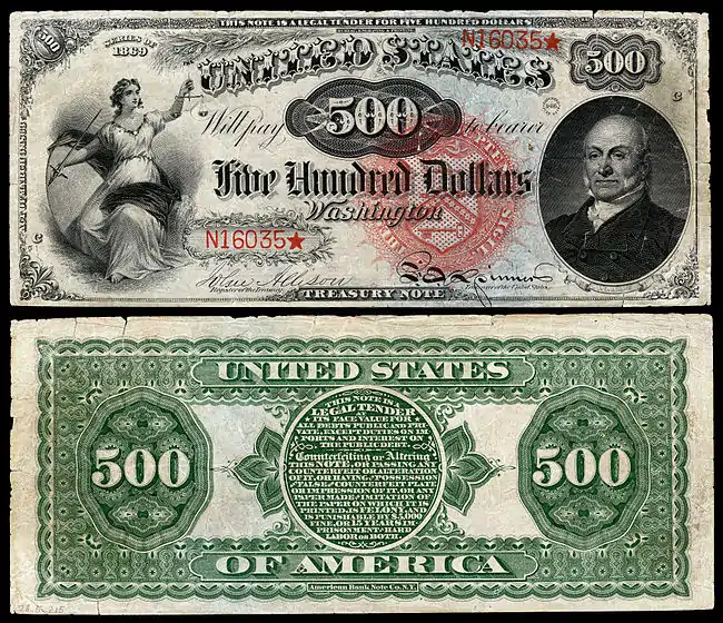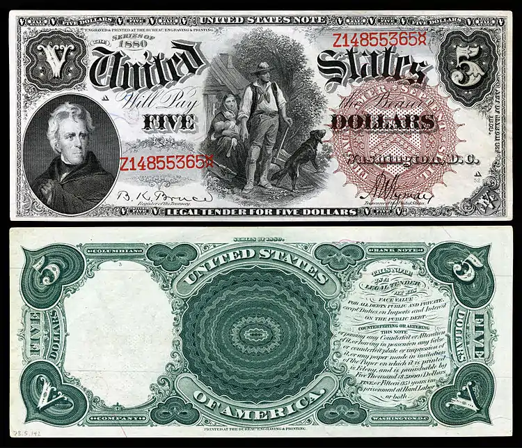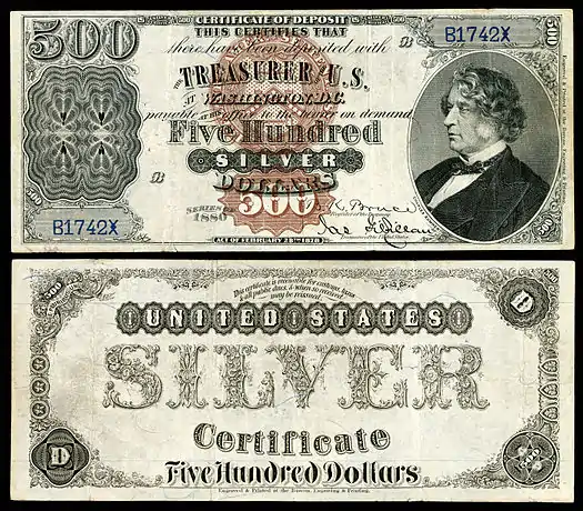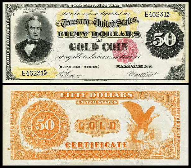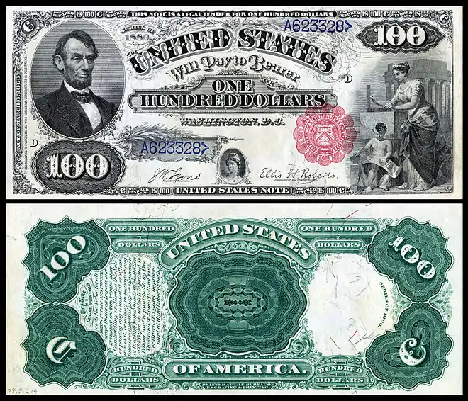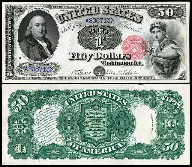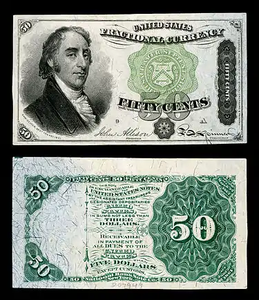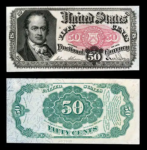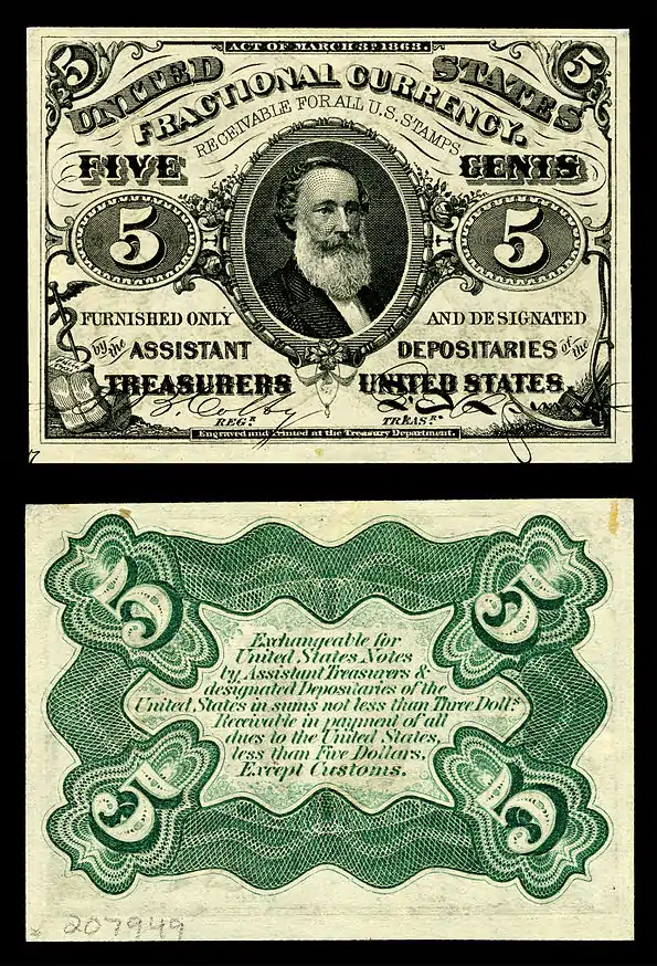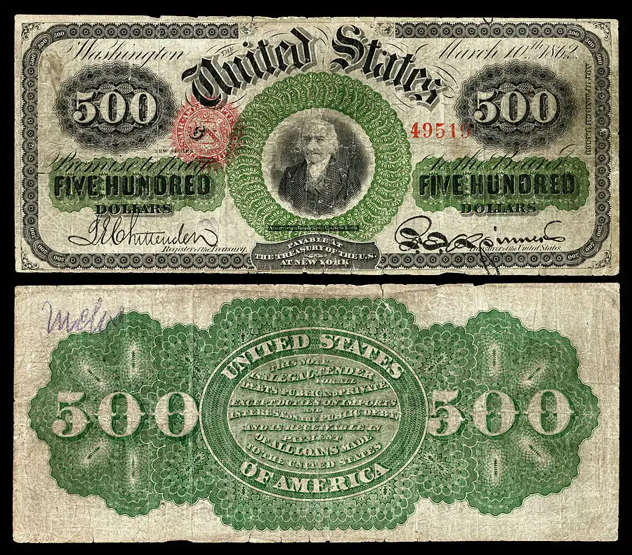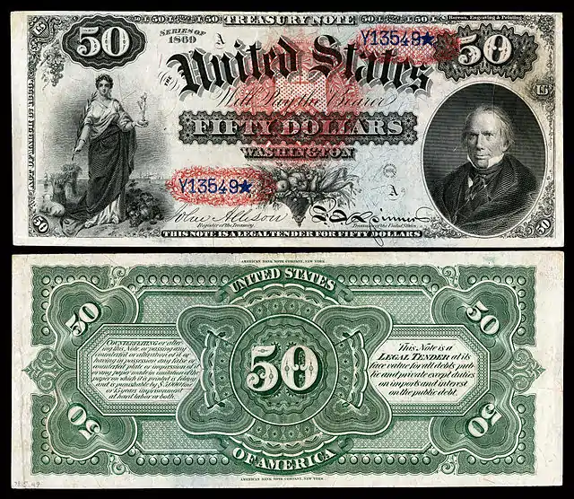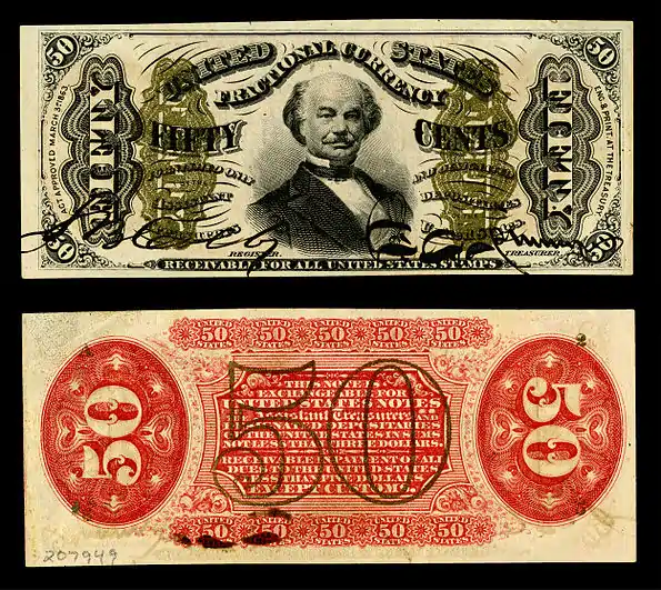 Портреты пяти государственных деятелей США были изображены на банкнотах при их жизни. Авраам Линкольн был изображён на предъявительском векселе номиналом 10 долларов в 1861 году. Салмон Чейз, министр финансов в кабинете Линкольна утвердил собственный портрет для размещения на казначейском билете номиналом 1 доллар в 1862 году. Портрет Уинфилда Скотта, главнокомандующего армией США был помещён на процентные вексели в начале 1860-х годов. В 1864 году Фрэнсис Спиннер, 10-й государственный казначей США и Спенсер Кларк, первый директор Бюро гравировки и печати дали своё согласие быть изображёнными на разменных банкнотах номиналом от 3 до 50 центов. Однако в 1873 году, во многом из-за действий Спиннера и Кларка, Конгресс запретил печатать портреты живущих людей на любых ценных, разменных, долговых бумагах, военных и почтовых документах США[4].