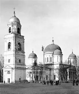 | Собор Иконы Божией Матери Казанская (Стерлитамак)[13] | 1837-1864 | Собор Казанской Божьей Матери[14] в г. Стерлитамаке заложен в 1837 г. Разрушен в 1938 году. Находился в г. Стерлитамак на Церковной площади (ныне парк им. С.М.Кирова). Построен и освящён в 1850 году (полностью построен в 1864 г.). Заложен как церковь в 1837 г. по проекту Оренбургской губернии архитектора Г.Алфеева на месте сгоревшей в 1834 деревянной церкви, сооружённой в 1806 году в честь иконы Казанской Божией Матери (в 1824 на пути из Оренбурга в Уфу церковь посетил Александр I), в 1878 году приобрёл статус собора. Храм был построен в стиле классицизма; каменный, 5-главый, увенчанный серебряными крестами, с отдельно расположенной 4-ярусной колокольней (гл. колокол весил 200 пудов), окружённый чугунной узорчатой оградой (1867). Представлял собой прямоугольное в плане здание, вход украшал портик с 6 колоннами. Собор имел 3 престола: главный — в честь Казанской Божией Матери (освящён в 1850), в правом приделе — во имя святителя Николая Чудотворца (1838), левом — во имя св. кн. Александра Невского (1851); в соборе находились 3 резных позолоченных иконостаса, в т.ч. иконостас, выполненный на средства И.Ф.Базилевского в Петербургской академии художеств (одна из икон выполнена членом этой академии М.Н.Воробьёвым), иконы Спасителя, Божией Матери, Сретения Господня и архангела Михаила в драгоценных ризах. Действовали приходское попечительство (с 1881), церковно приходская школа (с 1839), женская школа (с 1860-х гг.). В 1917 причт состоял из 2 протоиереев, 2 священников и дьякона. В 1929 собор закрыт, кресты и колокола сняты, здание передано под клуб. В 1937 был начат снос, продолжавшийся до начала 50-х гг. Настоятели: Ф.И.Базилевский, В.Н.Сперанский, П.В.Полозов, М.И.Кречетов. |