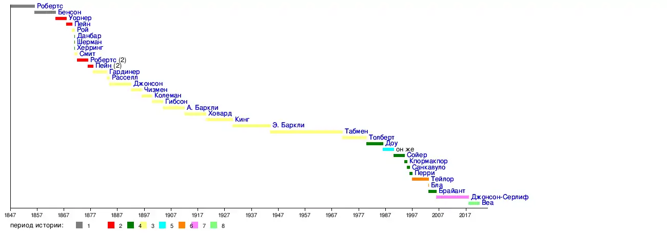 До провозглашения независимости Либерии в 1847 году исполнительная власть в колониальном Содружестве Либерии осуществлялась губернатором Либерии (а ещё ранее — колониальным агентом), который назначался Американским колонизационным обществом. В период с 1847 по 1980 годы президентами становились исключительно американо-либерийцы (англ. Americo-Liberians), — американские переселенцы в Либерию и их потомки. Начиная с 1878 года на протяжении 102 лет у власти в стране находилась Партия истинных вигов[2][3].