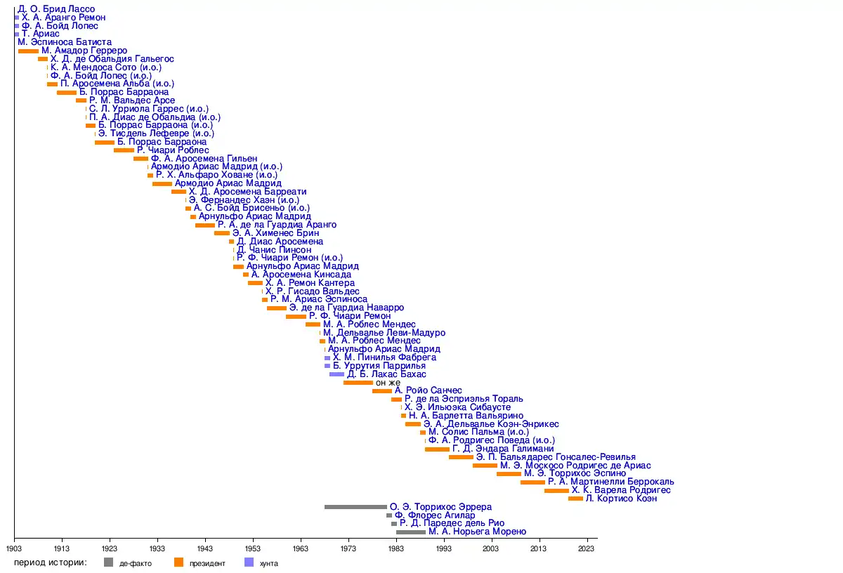 Отдельно выделены военные лидеры, руководившие страной де-факто с 1968 по 1989 годы. () Дополнительно показаны предпосылки успешного обретения Панамой государственной независимости в 1903 году, ставшей результатом продолжавшихся с войны за независимость от испанской короны конфликтов с центральным правительством Колумбии (Новой Гранады), кратковременного периода существования независимого Государства Перешейка () и значительного опыта различных форм автономного существования Панамы в предшествующий независимости период. ()