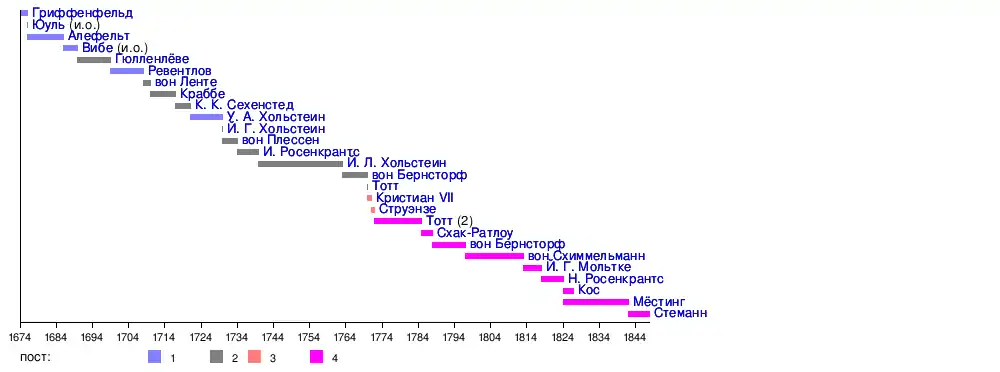 18 января 1772 | 10 сентября 1785[комм. 12] | председатель Тайного государственного совета дат. Praeides i Gehejmestatsraadet |