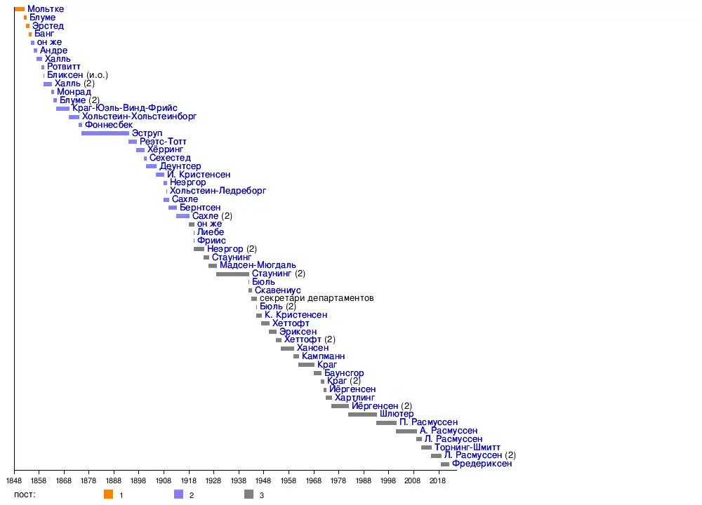 Курсивом на сером фоне в таблице выделены даты начала и окончания полномочий лиц, замещавших назначенных на пост, но временно отсутствующих лиц. Датские дворянские титулы греве / ленсгреве (дат. greve / lensgreve) и фрихерре / ленсбарон (дат. friherre / lensbaron) переданы соответственно как граф и барон. В качестве основного источника по этому периоду использован Список руководителей Дании на сайте www.worldstatesmen.org (англ.).