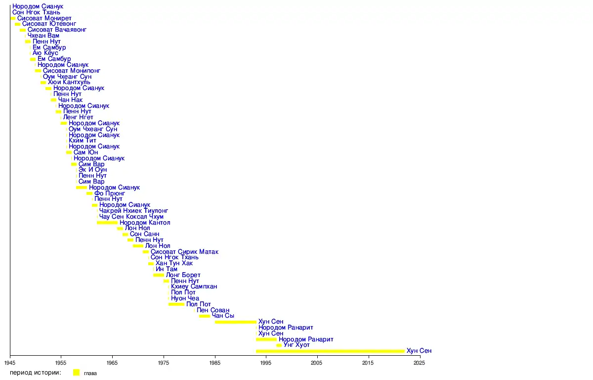 Начиная с 1945 года, пост главы правительства занимали 36 лиц (включая трёх исполняющих обязанности). Действующий премьер-министр Хун Сен занимает должность с 14 января 1985 года (37 лет 45 дней).