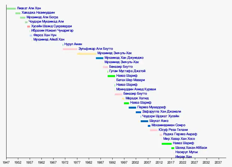 Должность премьер-министра за всю историю занимали двадцать человек, трое из которых избирались на два (Беназир Бхутто и Зия-уль-Хак) и четыре (Наваз Шариф) не следующих друг за другом срока. Четыре человека, были только исполняющими обязанности премьер-министра.