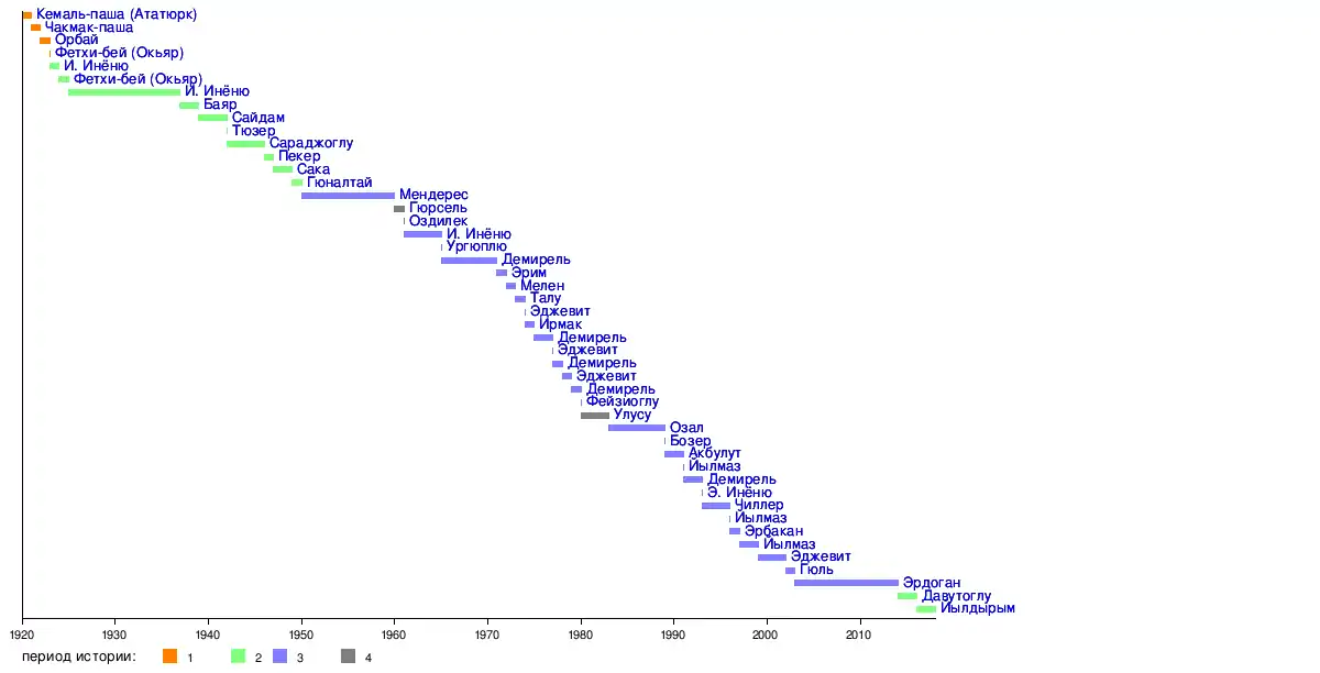 Формирование современного института руководителя правительства Турции произошло в последний период существования Османской империи, после подписания Мудросского перемирия (её капитуляции) 30 октября 1918 года. После оккупации Константинополя (ноябрь 1918 года) войсками Антанты и роспуска оттоманского парламента (16 марта 1920 года) возглавивший национально-революционное движение и войну за независимость в Анатолии Мустафа Кемаль созвал в Ангоре Великое Национальное Собрание Турции (ВНСТ), первое заседание которого открылось 23 апреля 1920 года. Сам М. Кемаль был избран председателем парламента и первым главой правительства Великого Национального Собрания, которое тогда не признавалось ни одной из держав[2][3]. Первая турецкая Конституция была принята ВСНТ 20 января 1921 года, делегировав все законодательные и исполнительные прерогативы самому ВСНТ, а по его усмотрению — образованному правительству[4].