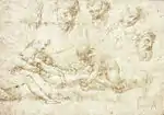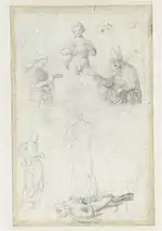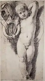 ![]() | Путто, держащий кольцо Медичи и перья | ок. 1513—1514 | Эскиз/Этюд | Н/Д | Музей Тейлора, Харлем | |