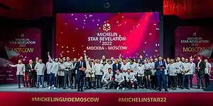 Россия стала 33-й страной, где выпускают гид «Мишлен», а Москва — первым городом на постсоветском пространстве с кафе и ресторанами, отмеченными звездами и специальными знаками. Ресторанный гид анонсировал свой приход на российский рынок 21 декабря 2020 года, после чего эксперты организации посетили Москву, чтобы выбрать рестораны, достойные рекомендаций[2][3][4]. Первая презентация гида по кафе и ресторанам Москвы состоялась 14 октября 2021 года в концертном зале «Зарядье» — девять ресторанов получили звёзды и вошли в гид по Москве на 2022 год. Семь ресторанов получили по одной звезде, два ресторана — по две, три звезды не получил ни один ресторан. Еще 45 ресторанов попали в список рекомендованных, без присуждения звёзд[5][6].