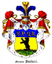 | В звании камергера Александр-Николай Филиппович Паулуччи (1840—1893) | Итальянский род из Перуджи, получивший титул маркиза в 1738 году от Франческо III Герцога Моденского (20.11.1783 года титул был подтверждён в Австрии) и обосновавшийся в 1753 году в Модене. Родоначальник русской ветви – Филипп Осипович (Филиппо) Паулуччи (1779—1849). Именным Высочайшим указом от 05.12.1890 года дозволено его сыну А. Ф. Паулуччи с нисходящим потомством пользоваться в России титулом маркиза. Род, возможно, угас в 1920 году со смертью маркиза Виктора Александровича Паулуччи. |
