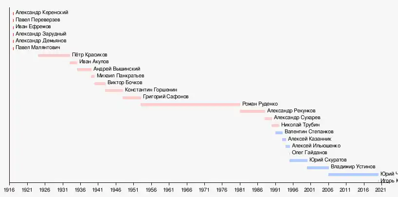В настоящем списке в хронологическом порядке представлены все лица, являвшиеся в разное время руководителями прокуратуры. Список содержит информацию о годах жизни, сроке полномочий, наименование ведомства и должности.