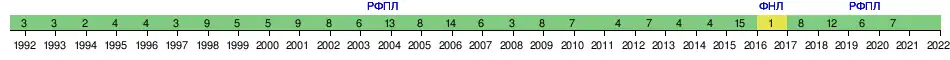 | 1999 | Высший дивизион | 30 | 12 | 8 | 10 | 44-41 | 44 | 4. Терёхин — 14 | |