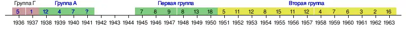 | 1941 | Группа «А» | 1 | ? из 15 | 12 | 3 | 7 | 2 | 16-16 | 13 | 7 000 | Виктор Матвеев (8) | — | [8]:65 [9]:125, 199[10][11][16]:36 |