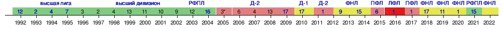 | 2016/2017 | Первенство ПФЛ, зона «Юг» | 3 | 1 из 16 | 30 | 21 | 4 | 5 | 66-24 | 67 | 2 446 | Алексей Жданов (23) | 1/128 финала | — | — |