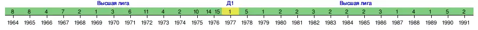| 1976 (в) | A | 15 | 4 | 2 | 9 | 10-18 | 10 | 14-е | (—) | Кубок УЕФА — 3R | Евгений Ловчев, Михаил Булгаков, Юрий Пилипко |