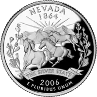 | Невада | Четвертак Невады — Тройка диких мустангов на фоне — горы и восходящее солнце. Края монеты обрамляют веточки полыни. Лента с надписью: «The Silver State» (Серебряный штат). |
