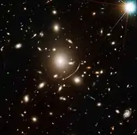 Abell 383, гигантское скопление эллиптических галактик в центре изображения содержит настолько большое количество тёмной материи, что её гравитация искривляет свет от объекта фона, что является примером гравитационного линзирования.
