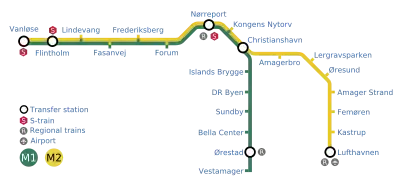 По состоянию на 2010 год в Копенгагенском метрополитене, который входит в сеть общественного транспорта, обслуживающую Копенгагенскую агломерацию: коммуны Копенгаген, Фредериксберг и Торнбю, насчитывается 22 действующих станций метро на двух линиях (M1 и M2). Из них 9 станций являются подземными (3 станции мелкого заложения и 6 глубокого) и 11 станций — наземными или надземными (эстакада)[1].