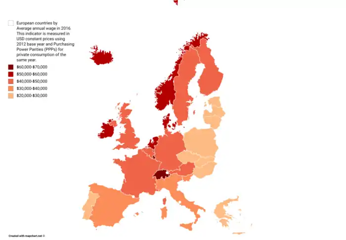 Страны обозначенные на карте фиолетовым цветом имеют валовые среднемесячные зарплаты (до налогов) превышающие € 4000, синим — от € 2000 до € 4000, оранжевым — от € 700 до € 2000, красным — ниже € 700.