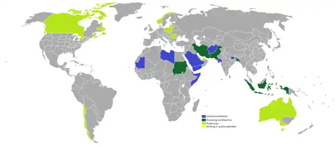 По состоянию на 2021 год практически все страны (за исключением Австралии), применяющие сухой закон, являются или полностью исламскими или с преобладанием мусульман на отдельных территориях.