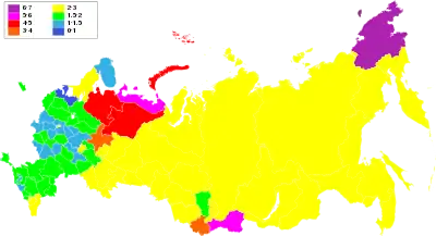 | Сибирский федеральный округ | 1.86 | ↗1.88 | ↗1.90 | ▬1.90 | ↘1.87 | ↘1.72 | ↘1.64 | ↘1.54 | ↘1.52 |