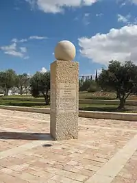 Надпись: «Председатель Верховного суда, один из отцов-основателей, заложивших основу верховенства права, свободы слова и независимости судебной власти в государстве Израиль».
