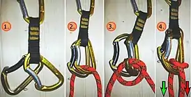 Альпинисткий У. с двойной петлёй для завязывания петель самостраховки, крепление к карабину.