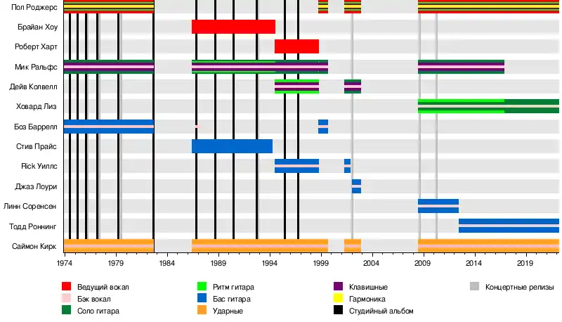 В текущем же составе группы есть постоянный участник Кирк, Роджерс (который отсутствовал только между 1986 и 1998 годами), гитарист Ховард Лиз (который присоединился в 2008 году), а также басист Тодд Роннинг (который присоединился в 2012 году).