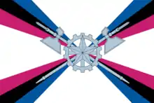 10.08.2005[32]—18.11.2011[33] | Флаг воинских частей и организаций расквартирования и обустройства войск | Четырёхконечный белый крест с расширяющимися концами и с равноразделёнными между концами креста чёрно-красными углами. В центре — изображение серебряных остроконечного шлема в центре четырёхбастионной фортеции с продетыми накрест молотком и топором. |