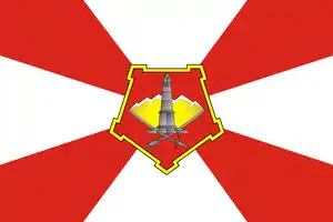 08.12.2006[20] | Флаг ракетных войск и артиллерии | Четырёхконечный белый крест с расширяющимися концами и с равноразделёнными между концами креста чёрно-красно-чёрными лучами. В центре — изображение двух золотых диагонально перекрещённых стволов орудий. |