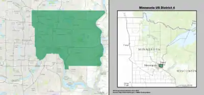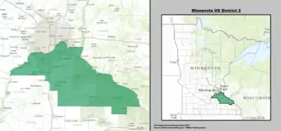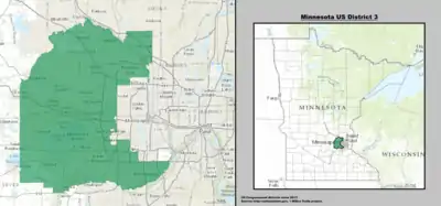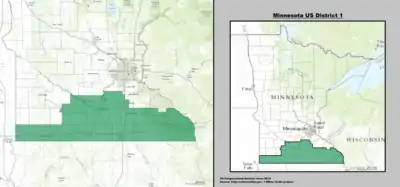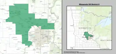 На 2012 год штат Миннесота разделён на 8 избирательных округов. 1-й избирательный округ расположен на юге штата и простирается от границы с Южной Дакотой до границы с Висконсином (на 2015 год население оценивалось в 668 741 человек). 2-й избирательный округ расположен к югу от столицы штата (на 2015 год население оценивалось в 695 029 человек). 3-й избирательный округ охватывает пригороды Миннеаполиса (на 2015 год население оценивалось в 700 121 человек). 4-й избирательный округ включает город Сент-Пол и его пригороды (на 2015 год население оценивалось в 704 158 человек). 5-й избирательный округ состоит из города Миннеаполис (на 2015 год население оценивалось в 707 578 человек). 6-й избирательный округ находится к северо-западу от столицы штата (на 2015 год население оценивалось в 687 034 человека). 7-й избирательный округ занимает почти всю западную часть штата и является крупнейшим по площади округом штата (на 2015 год население оценивалось в 663 263 человека). 8-й избирательный округ находится на востоке штата (на 2015 год население оценивалось в 663 670 человека)[3][4].