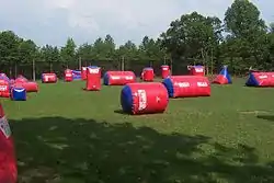 Отличительная особенность спортивного пейнтбола — это огороженная защитной сеткой, высота не менее 6 метров, площадка (45 м на 36м) с ровным искусственным (ковролин) или естественным покрытием (трава, газон), где роль укрытий выполняют симметрично расположенные надувные фигуры. Более высокая степень безопасности игроков, в отличие от тактического пейнтбола осуществляется за счёт строгих правил проведения турниров (качество площадки, наличие судей, контроль оборудования игроков и многое другое).