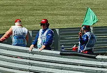 - Звучит звуковой сигнал, и показывается информационное табло. Горит одна пара красных сигналов. Всякий пилот, которому требуется помощь для старта, должен поднять руку. В этом случае позади машины становятся маршалы с желтыми флагами, чтобы предупредить остальных пилотов.