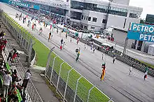 - Открывается пит-лейн, и болиды занимают своё место на стартовой решетке с заглушёнными моторами. Пилот может выполнить несколько ознакомительных кругов, но обязан следовать через пит-лейн (на сниженной скорости) и не пересекать стартовую решетку.